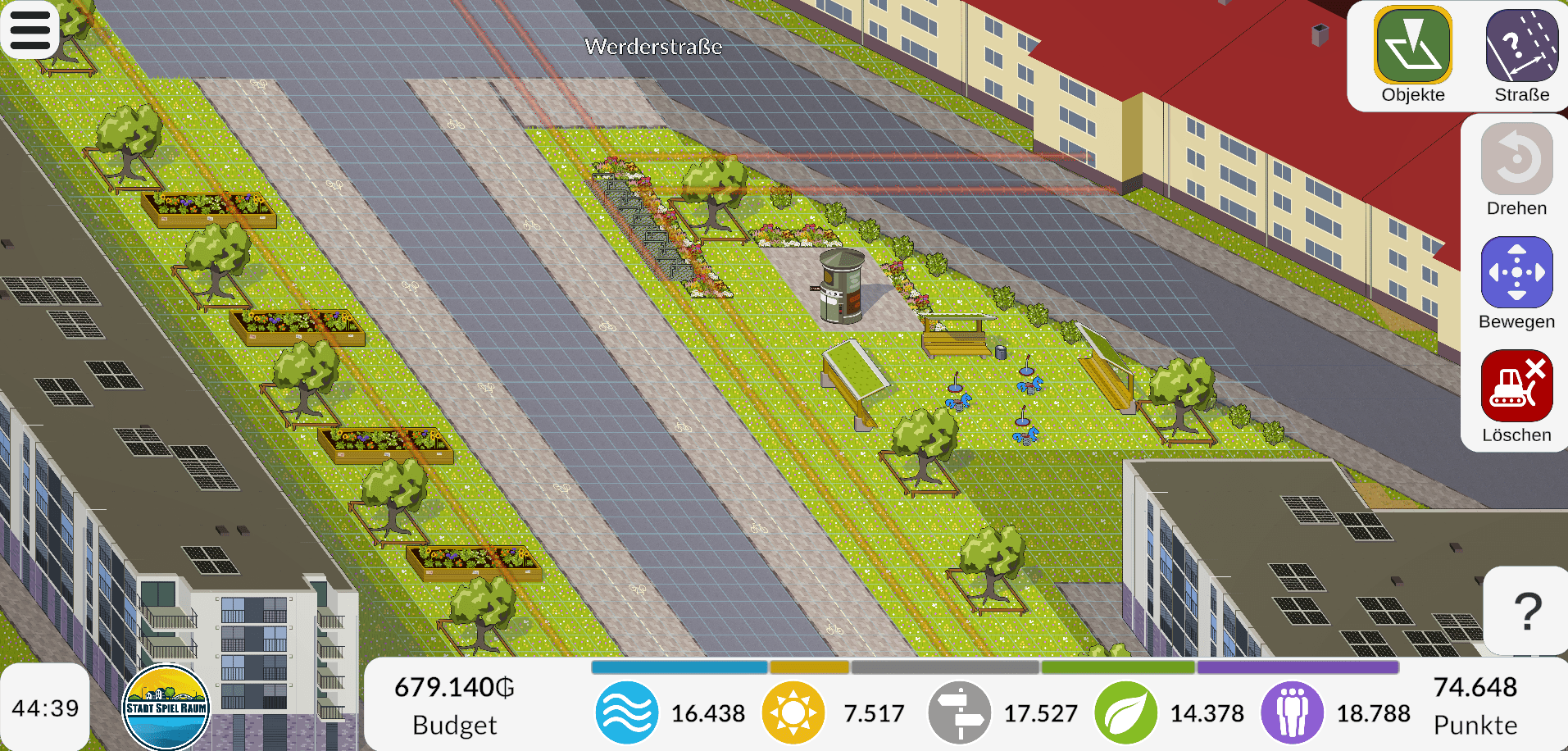 StadtSpielRaum ist ein web- und appbasiertes Spiel für digitalisierte Bürgerbeteiligung, welche den Faktor „Gamification“ in den Vordergrund rückt. Bürger und Bürgerinnen sollen mithilfe einer Bausimulation eines echten Straßenabschnitts in der Stadt Brandenburg an der Havel mit der Stadtverwaltung in Interaktion treten, die Herausforderungen von Stadtplanung besser verstehen und der Stadt neue Impulse und Ideen für klimaangepasste Straßenbilder bringen. StadtSpielRaum ist ein Ergebnis des Projekts „Let’s Play Klimaanpassung“ gefördert vom Ministerium für Infrastruktur und Landesplanung des Landes Brandenburg durch die Initiative „Meine Stadt der Zukunft“. Das digitale Beteiligungsspiel StadtSpielRaum bietet Bürgerinnen und Bürgern die Möglichkeit, den Straßenraum der südlichen Bauhofstraße in Brandenburg an der Havel virtuell neu zu gestalten. Ziel ist es, spielerisch Herausforderungen der Klimaanpassung und einer nachhaltigen Stadtentwicklung erfahrbar zu machen und eigene Lösungsansätze zu entwickeln. Im Spiel übernehmen die Teilnehmenden die Rolle einer stadtplanenden Person. Im ersten Schritt können sie den Straßenraum verändern. Als Beispiele sind: