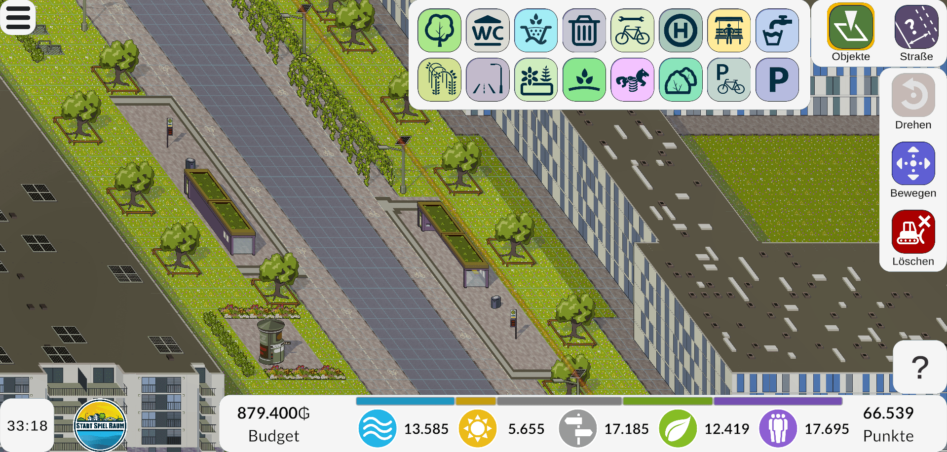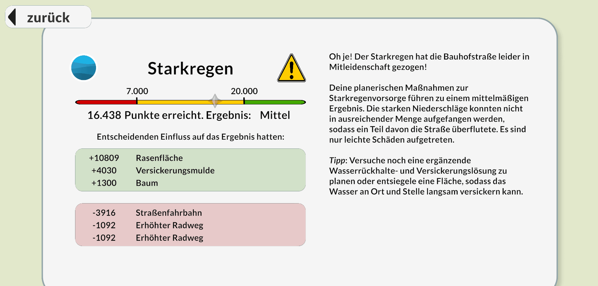 - Mittelstreifen entfernen oder begrünen - Parkplätze entfernen oder beibehalten - Gehwege verbreitern oder als Geh- und Radweg kombinieren Anschließend können die Spielenden aus einer Vielzahl von Objekten zur Gestaltung der Straße auswählen und deren Auswirkungen auf den Straßenraum unmittelbar durch die Veränderung von Punkten nachvollziehen. Den Code für das Backend finden Sie im GitLab-Repository "Lets Play Klimaanpassung Backend".