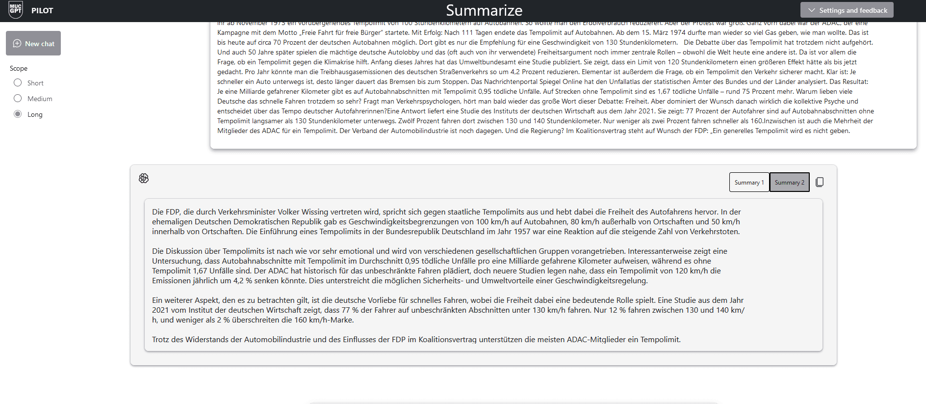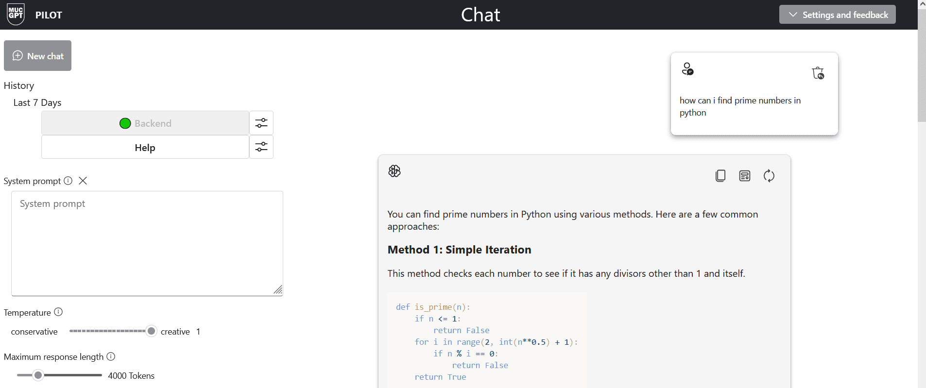 MUCGPT hat vier Hauptfunktionen und bietet die Möglichkeit, eigene Assistenten mit spezifischen Funktionen zu erstellen. Die Hauptfunktionen sind Chat zum Austausch mit dem zugrunde liegenden LLM, Zusammenfassen zum Verdichten langer Texte und Dateien, Brainstorming zum Erstellen von Mindmaps zu einem Thema und Einfache Sprache, um Texte in leichter verständliche Sprache zu übersetzen. Chat Die Chat-Funktion von MUCGPT ist ein typischer Chatraum, in dem Sie mit dem LLM schreiben können, um Informationen zu nahezu jedem Thema zu erhalten. MUCGPT kann Antworten erzeugen, die denen eines Menschen sehr ähnlich sind, da es ein großes vortrainiertes Sprachmodell verwendet. Es verfügt über eine Reihe von Funktionen und Fähigkeiten, die es ermöglichen, natürliche Sprachverarbeitung, mehrstufige Gespräche, Personalisierung, Stimmungsanalyse, Wissensabfrage und Aufgabenbearbeitung umzusetzen. Diese Fähigkeiten helfen MUCGPT dabei, Benutzeranfragen so zu verstehen und zu beantworten, dass sie an die jeweiligen Bedürfnisse angepasst sind, was es zu einem leistungsstarken Werkzeug für Anwendungsfälle macht, in denen eine menschenähnliche Interaktion gewünscht ist. Darüber hinaus können Benutzer eine Systemanweisung konfigurieren, die allen von ihnen gesendeten Nachrichten vorangestellt wird. Auch die Temperatur der generierten Antwort lässt sich anpassen, um die Zufälligkeit oder Kreativität der Modellausgabe zu steuern. Die Chat-Funktion enthält einen Chatverlauf, mit dem Benutzer ihre früheren Unterhaltungen einsehen und dort weitermachen können, wo sie aufgehört haben. Außerdem können wichtige Chats als Favoriten markiert werden, um schneller darauf zuzugreifen. Der gesamte Chatverlauf wird lokal im Browser des Benutzers mit IndexedDB gespeichert, sodass keine Chataufzeichnungen in der Cloud oder an anderer Stelle gespeichert werden.