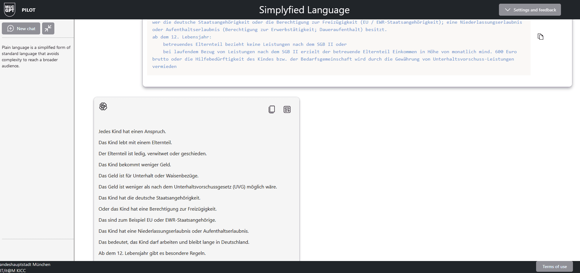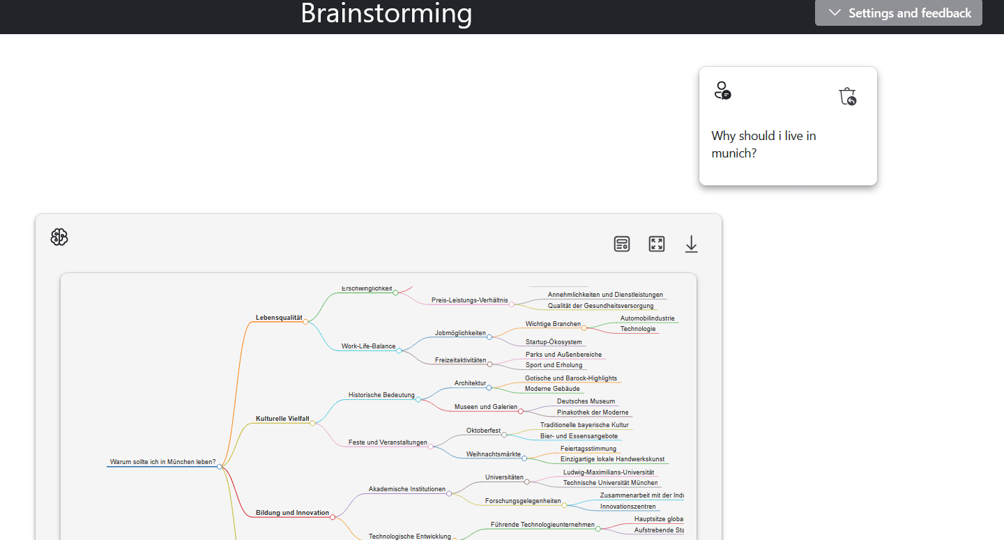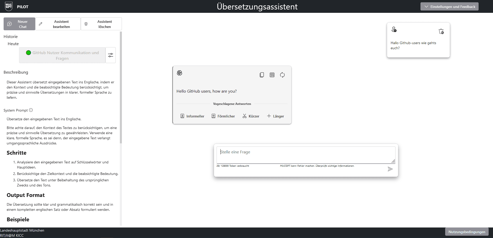 Zusammenfassen Die Funktion zum Zusammenfassen ermöglicht es, lange Texte oder Dokumente zu verdichten und die relevantesten Informationen zu extrahieren, um einen neuen zusammengefassten Text zu erstellen. Der Benutzer kann den Detaillierungsgrad der generierten Antwort in drei Stufen anpassen (kurz, mittel, lang). Brainstorming Die Brainstorming-Funktion ermöglicht es Benutzern, Mindmaps zu erstellen, um Inspiration zu einem bestimmten Thema zu finden. Die erstellten Mindmaps können heruntergeladen und mit Freeplane weiterverarbeitet werden. Einfache Sprache Einfache Sprache ist eine Funktion, mit der sich komplexe Texte in verständliche Sprache übersetzen lassen. Dies ist besonders hilfreich für Menschen mit Leseschwierigkeiten oder für Personen, deren Muttersprache nicht die Originalsprache ist. Durch die Umwandlung komplizierter Sätze und fortgeschrittener Wortwahl in einfachere Strukturen und geläufigere Wörter macht das Werkzeug den Text verständlicher und leichter lesbar. Das verbessert nicht nur die Zugänglichkeit der Inhalte, sondern fördert auch Inklusion, indem es ein breiteres Publikum mit unterschiedlichen Sprachkenntnissen anspricht. Die Prompts und die Logik dieser Funktion basieren auf dem Projekt der Kantonsverwaltung Zürich (Github). Eigene Assistenten MUCGPT ermöglicht es Benutzern, eigene benutzerdefinierte Assistenten zu erstellen, die auf spezifische Anforderungen und Anwendungsfälle zugeschnitten sind. Durch die Definition individueller Prompts und die Konfiguration des Verhaltens des Sprachmodells können Assistenten entwickelt werden, die spezialisierte Aufgaben übernehmen oder gezielte Informationen bereitstellen. Diese Funktion ist besonders nützlich für Unternehmen, Bildungseinrichtungen und Entwickler, die maßgeschneiderte Lösungen für ihre Arbeitsabläufe benötigen. Beim Erstellen eines Assistenten wird eine Systemanweisung festgelegt, die die Antworten des Assistenten steuert. Außerdem werden Parameter wie die Temperatur definiert, um die Kreativität der Ausgabe zu beeinflussen, und die Länge der Ausgabetoken festgelegt. Benutzer können mehrere Assistenten speichern und verwalten und je nach Bedarf zwischen ihnen wechseln, um unterschiedliche Aufgaben oder Szenarien abzudecken. Die Assistenten werden lokal im Browser mit IndexedDB gespeichert. Die Flexibilität der Funktion Eigene Assistenten ermöglicht es den Benutzern, das volle Potenzial von MUCGPT auszuschöpfen und das System zu einem vielseitigen Werkzeug für eine breite Palette von Anwendungen zu machen. MUCGPT unterstützt außerdem die Erstellung statischer, schreibgeschützter Community-Assistenten, die allen Benutzern zur Verfügung stehen. Diese Assistenten können in der `.env`-Datei definiert werden, sodass Administratoren vordefinierte Assistenten einrichten können, die häufige Anforderungen abdecken oder standardisierte Antworten bereitstellen. Dies stellt sicher, dass alle Benutzer Zugriff auf konsistente und zuverlässige Assistenten haben, ohne diese verändern zu können, und sorgt so für Einheitlichkeit und Kontrolle über die bereitgestellten Informationen. Diese Assistenten können mit Beispielen und Schnellprompts versehen sein, die dem Benutzer zeigen, wie der Assistent verwendet wird. Durch den Einsatz von Community-Assistenten können Organisationen sicherstellen, dass ihre Benutzer Zugriff auf wichtige Werkzeuge und Informationen haben, die auf ihre spezifischen Anforderungen zugeschnitten sind, was das gesamte Nutzungserlebnis und die Produktivität verbessert. Allgemeine Funktionen Erzeugte Texte in verschiedenen Formaten werden korrekt dargestellt. Folgende Formate werden derzeit unterstützt: