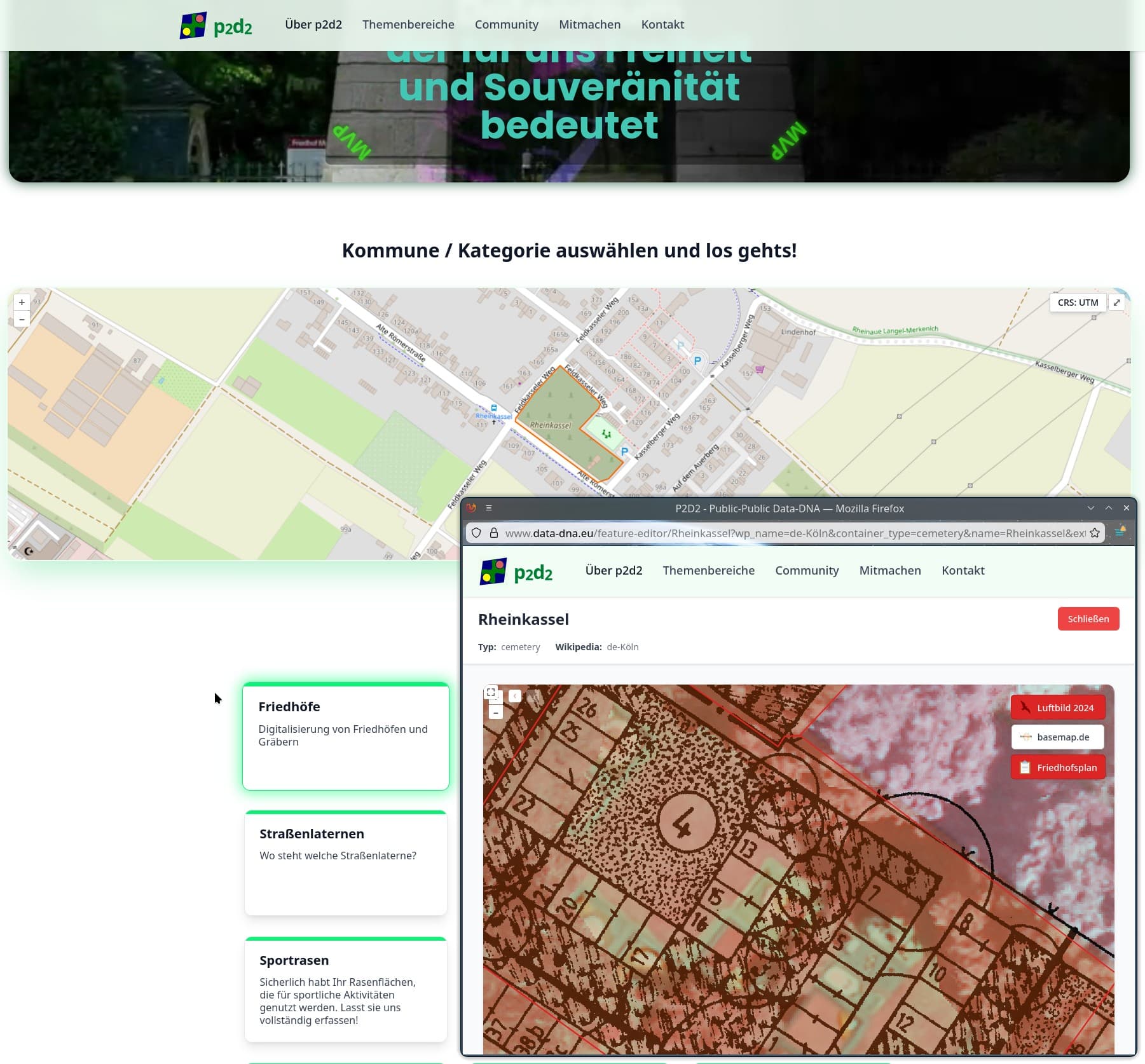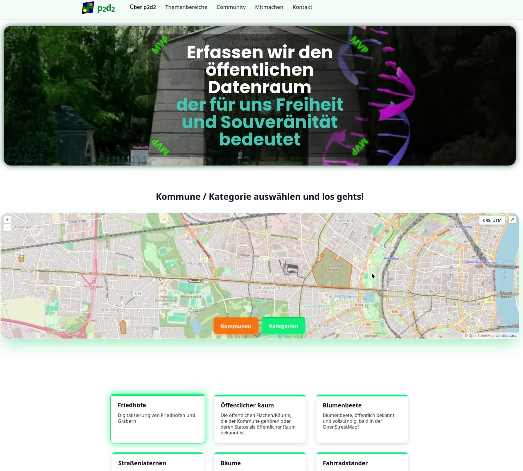 p2d2 (Public-Public Data-DNA) ist eine moderne Geodateninfrastruktur (GDI), die offene Verwaltungsdaten mit Bürgerdaten verzahnt. Das Projekt verfolgt das Ziel, offene Verwaltungsdaten mit OpenStreetMap, WikiData und anderen öffentlichen Datenplattformen zu synchronisieren.