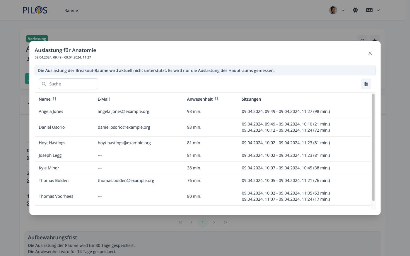 - Statistik Erhalten Sie detaillierte Berichte über die Anwesenheit und Nutzung Ihrer Videokonferenzen.