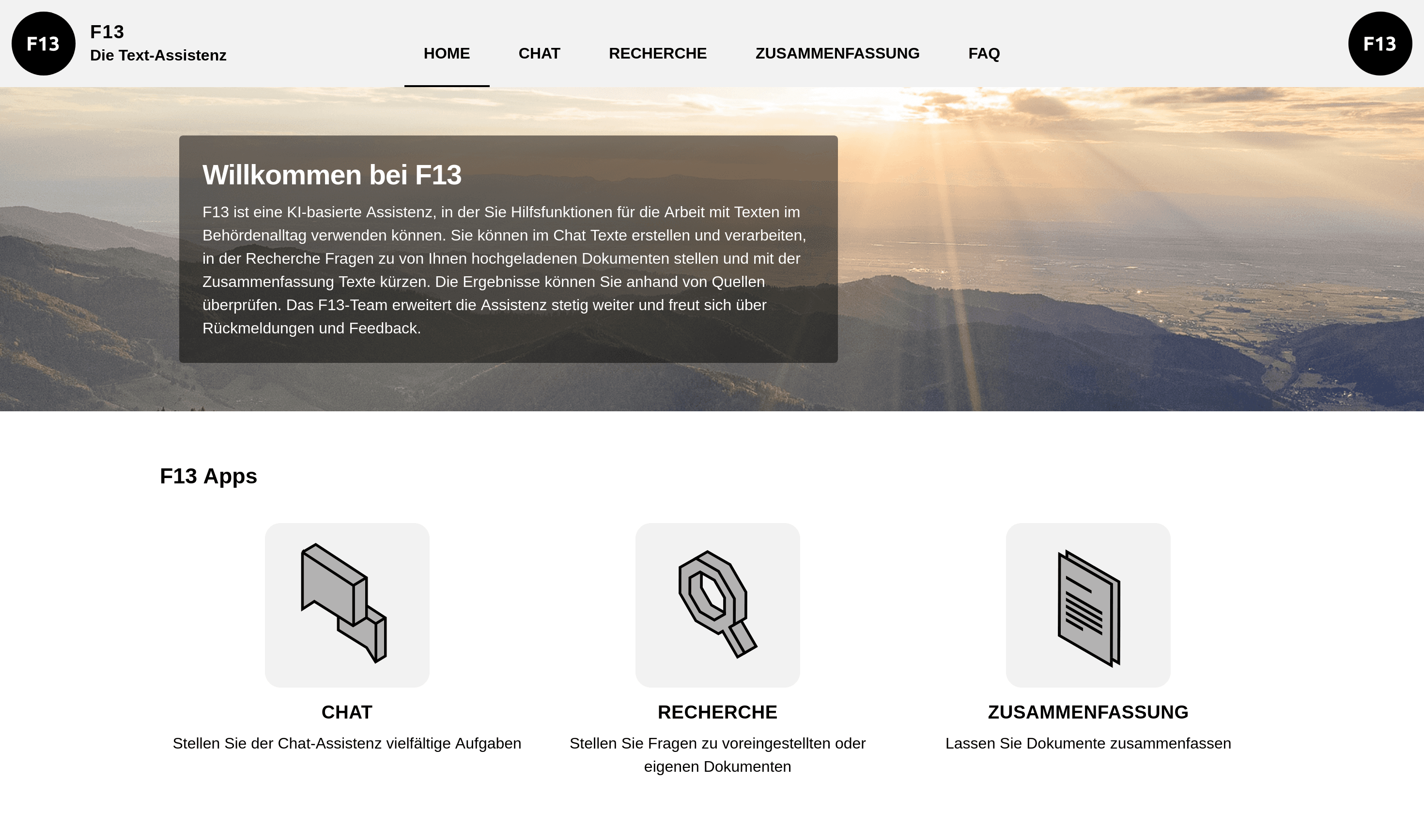 F13 stellt eine Vielzahl modularer, flexibel einsetzbarer KI-Funktionen bereit – zum Verarbeiten von Informationen, Erstellen von Texten, oder zum Recherchieren. Nutzende können mit F13 gezielt, wirksam und sicher Generative Künstliche Intelligenz bei täglichen Büroarbeiten einsetzen. Mit dem Übergang in eine Open-Source-Weiterentwicklung wird F13 seit Juli 2025 als gemeinschaftliches Vorhaben geöffnet: Der Quellcode steht frei zur Verfügung, die Nutzung ist offen. Interessierte Verwaltungen, Organisationen sowie Entwicklerinnen und Entwickler sind eingeladen, das System für eigene Bedarfe anzupassen, weiterzuentwickeln und diese Entwicklungen wiederum Open Source bereitzustellen. F13 versteht sich als Beitrag zu einer modernen, transparenten und kooperativen Verwaltungsdigitalisierung – praxisnah erprobt, offen zugänglich und auf das Gemeinwohl ausgerichtet. F13 ist Work-in-Progress und es gibt somit allen, die KI-Basislösungen in die deutsche Verwaltung tragen wollen, die Möglichkeit zur Mitwirkung.
